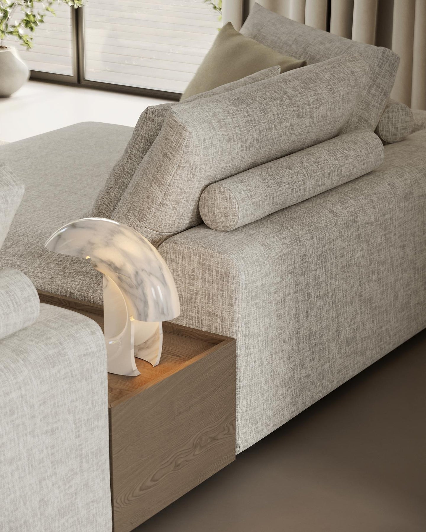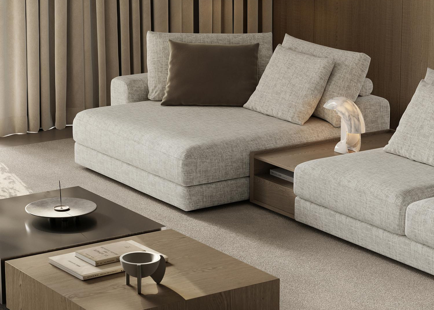 La table en chêne, équipée d’un tiroir coulissant et disponible dans la collection, s’intègre avec élégance à la silhouette du mobilier. Elle allie subtilement fonctionnalité et esthétique : un espace idéal pour déposer un livre, un verre de vin ou un objet décoratif qui vient souligner le style unique de l’intérieur.