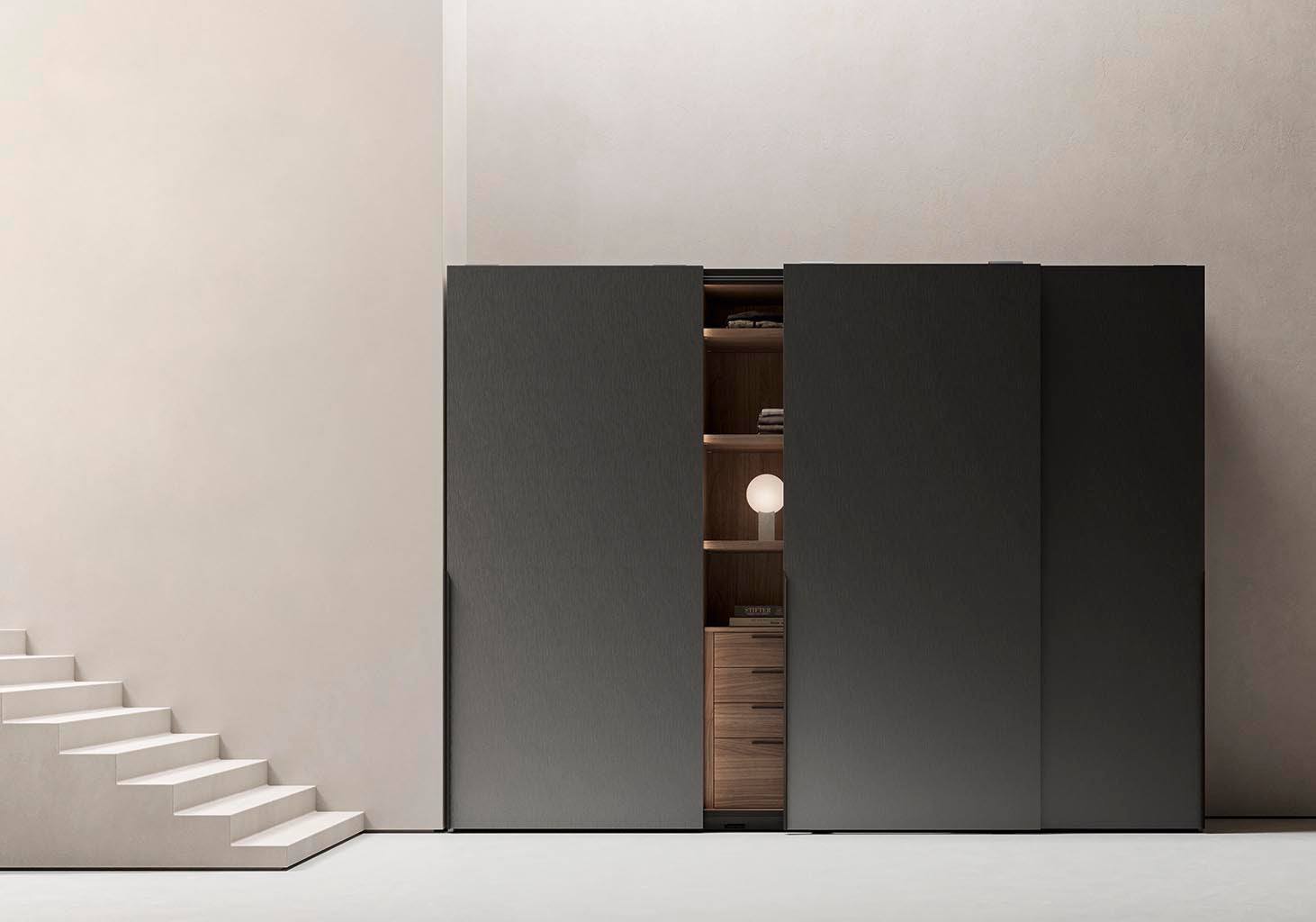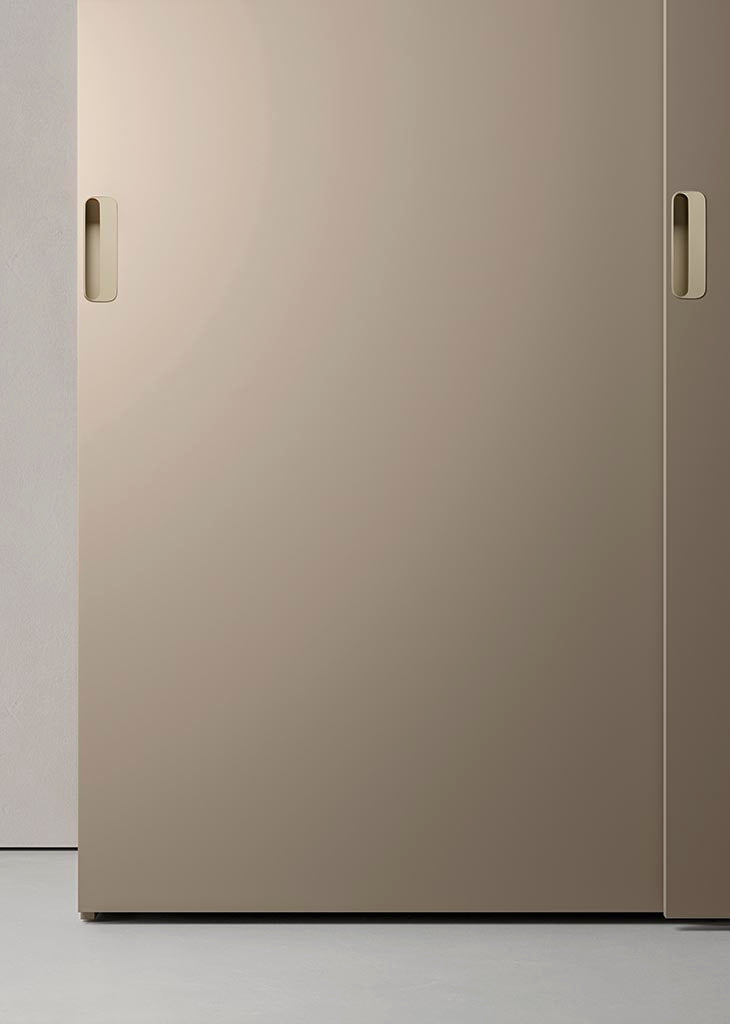 Even is available in hinged and sliding versions in a wide range of melamine and matt colours.