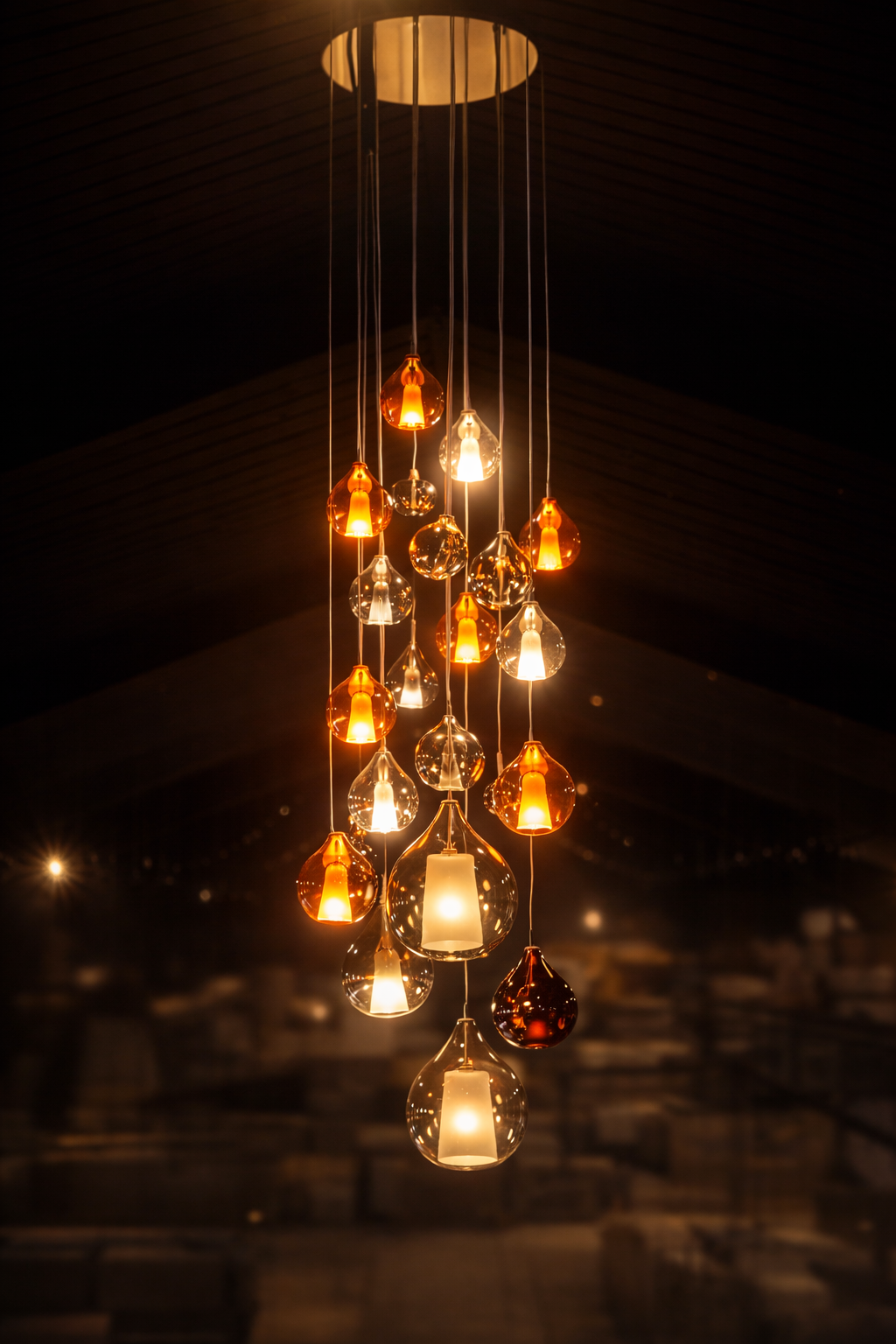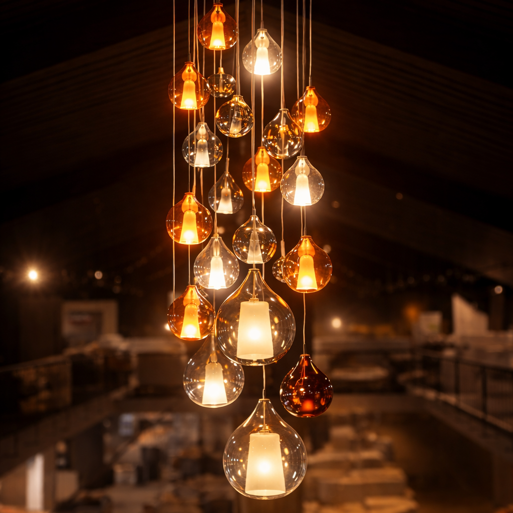 En optant pour une suspension de plusieurs dizaines de pièces couleur ambre, cuivre et or, il est possible de créer de véritables cascades de lumière qui transforment la plus froide des salles en un lieu aussi fascinant que rassurant.