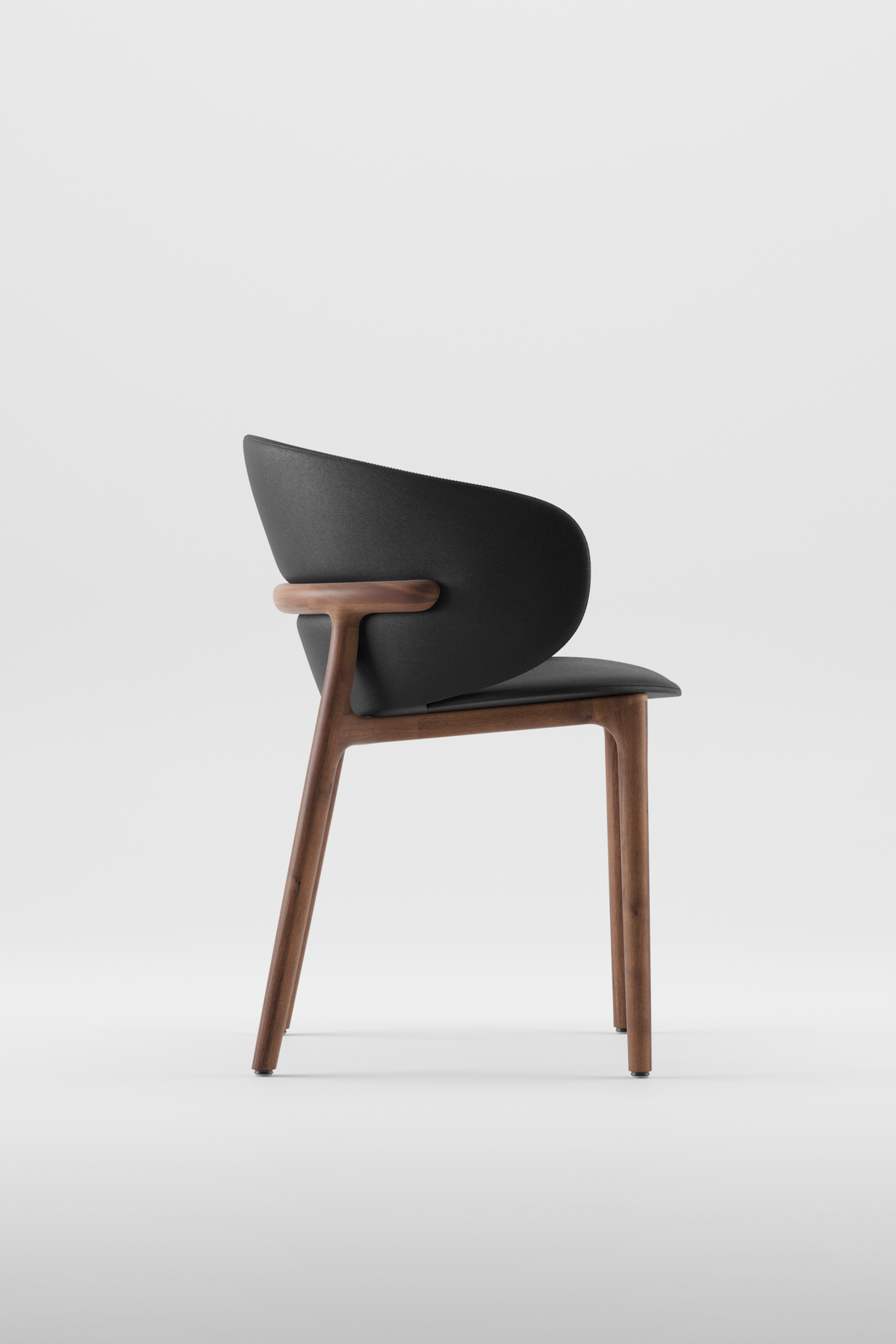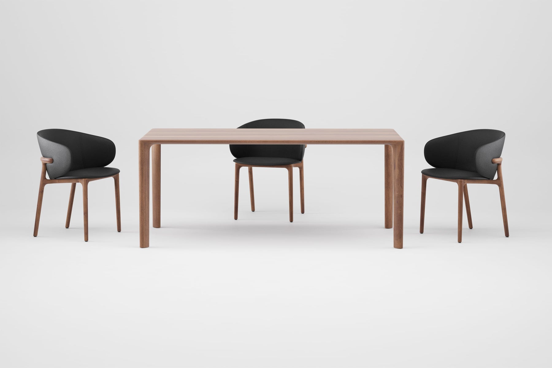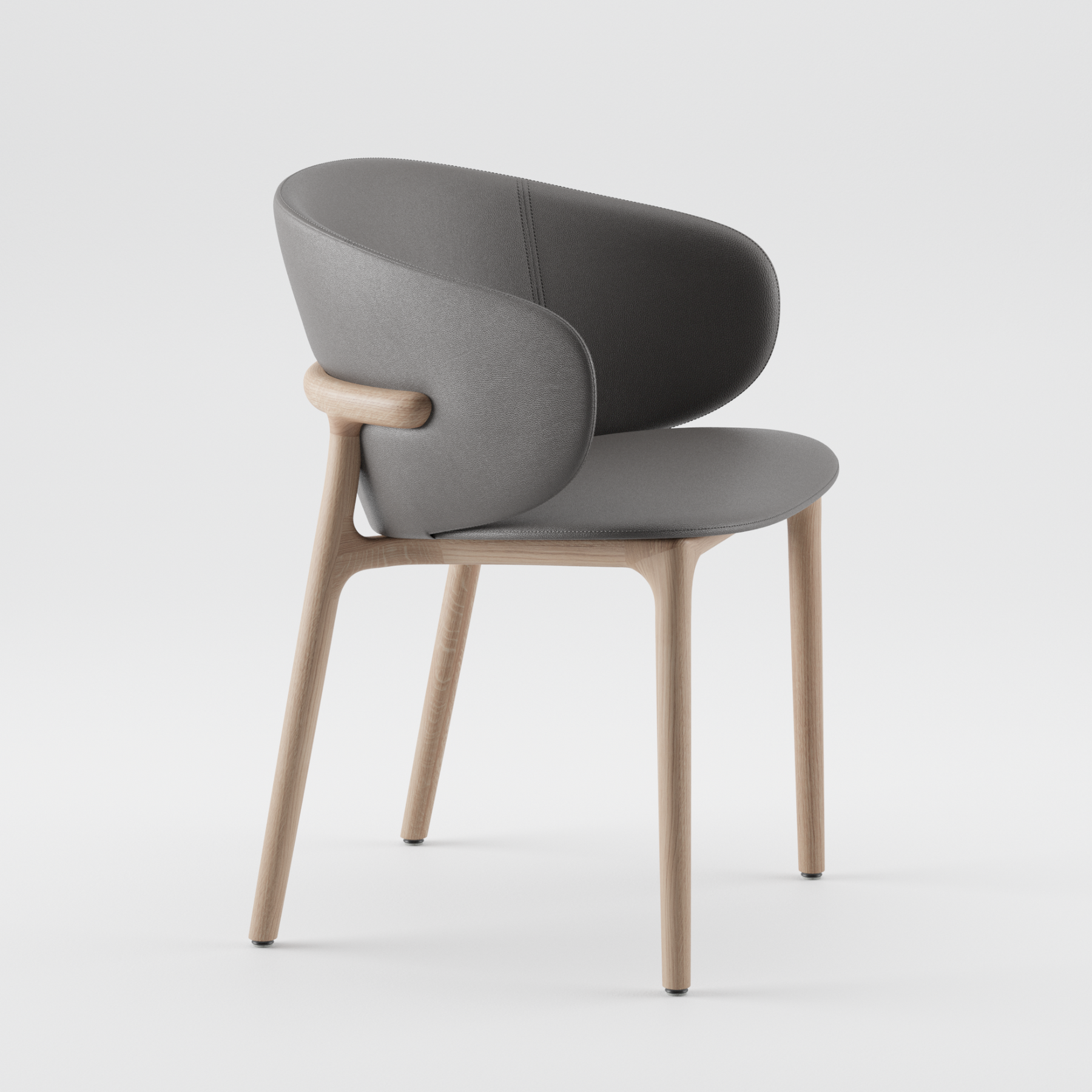 The Mela chair is available in 6 different wood species (oak, walnut, maple, elm, cherry and pear), with different natural finishes (oils and soaps) and upholstered in a range of leathers or fabrics.